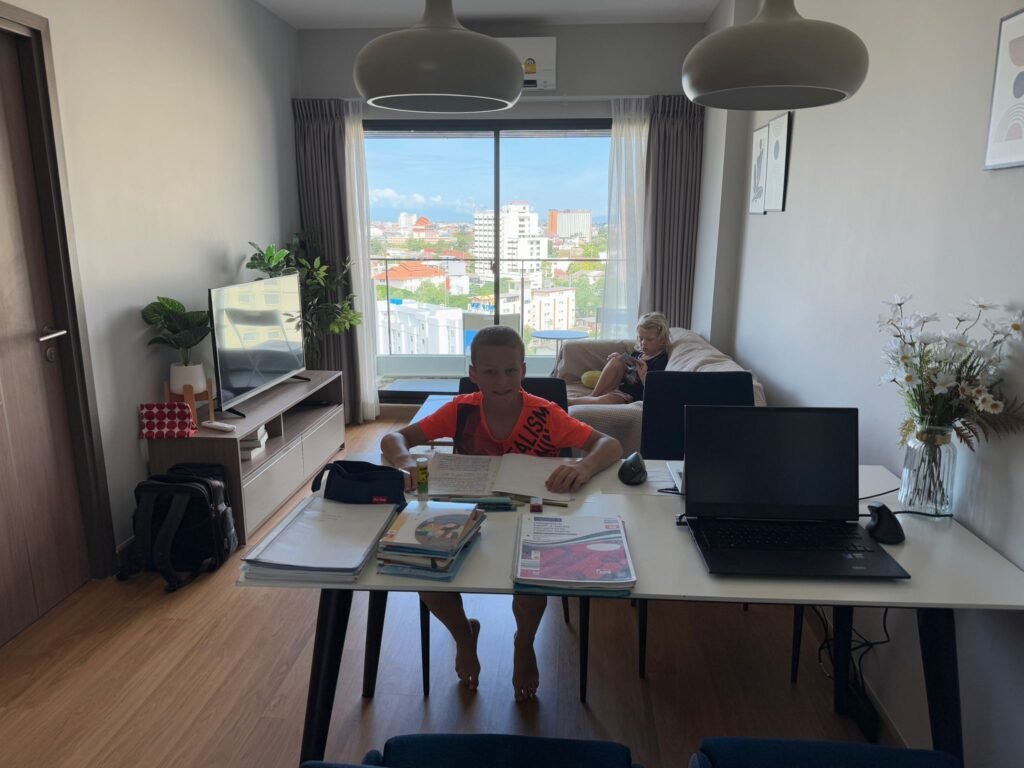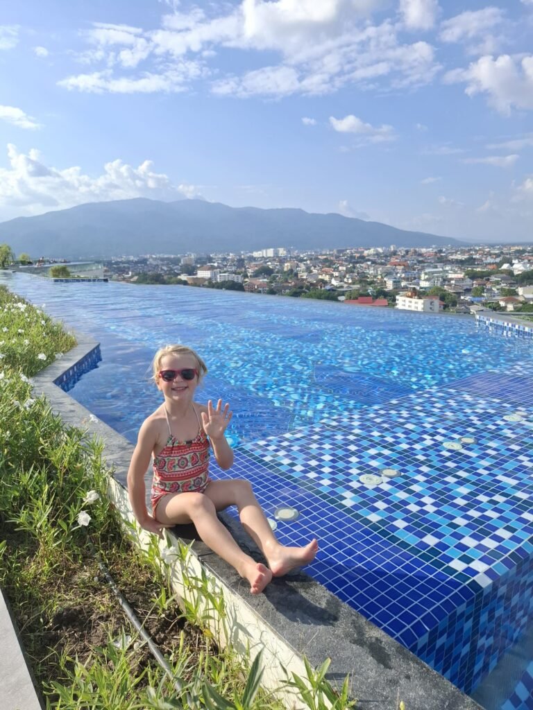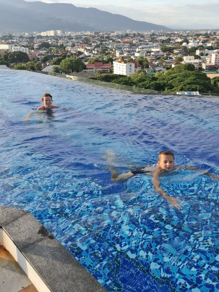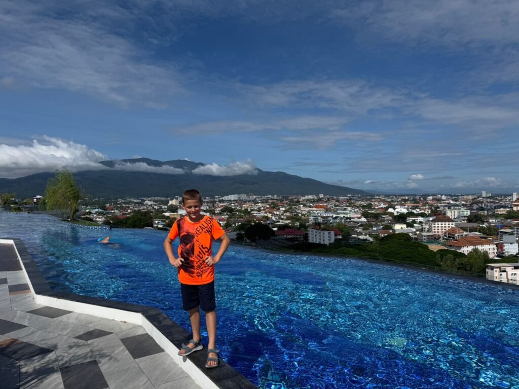 Chiang Mai war die Hauptstadt des ehemaligen Königreichs Lanna und wurde 1296 von König Mangrai gegründet. Die Stadt war über 400 Jahre lang das politische, kulturelle und wirtschaftliche Zentrum des Nordens und ist bis heute eine wichtige Metropole in Nordthailand. Nun sind wir schon seit über einer Woche hier. Die Stadt fühlt sich ganz anders an als Bangkok oder die Orte an der Küste. Chiang Mai ist ruhiger, grüner und weitläufiger. Obwohl es sehr international ist und man Menschen aus vielen Ländern trifft, hat die Stadt eine entspannte Atmosphäre. Zwischen Tempeln, Märkten und kleinen Straßen mit Cafés entsteht ein Alltag, der sich gleichzeitig vertraut und aber neu anfühlt. Unsere Anreise aus Koh Chang war dennoch ein kleiner Kraftakt. Für die gut tausend Kilometer per Flugzeug brauchten wir am Ende elf Stunden. Die erste Woche wohnen wir in einer großen Apartmentanlage mit Pool in der 17. Etage. Dort oben über der Stadt zu schwimmen hat etwas Besonderes und der Blick über Chiang Mai beeindruckt uns jedes Mal aufs Neue.