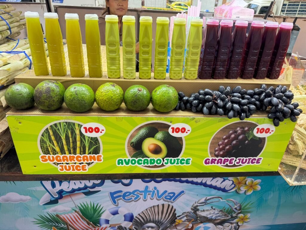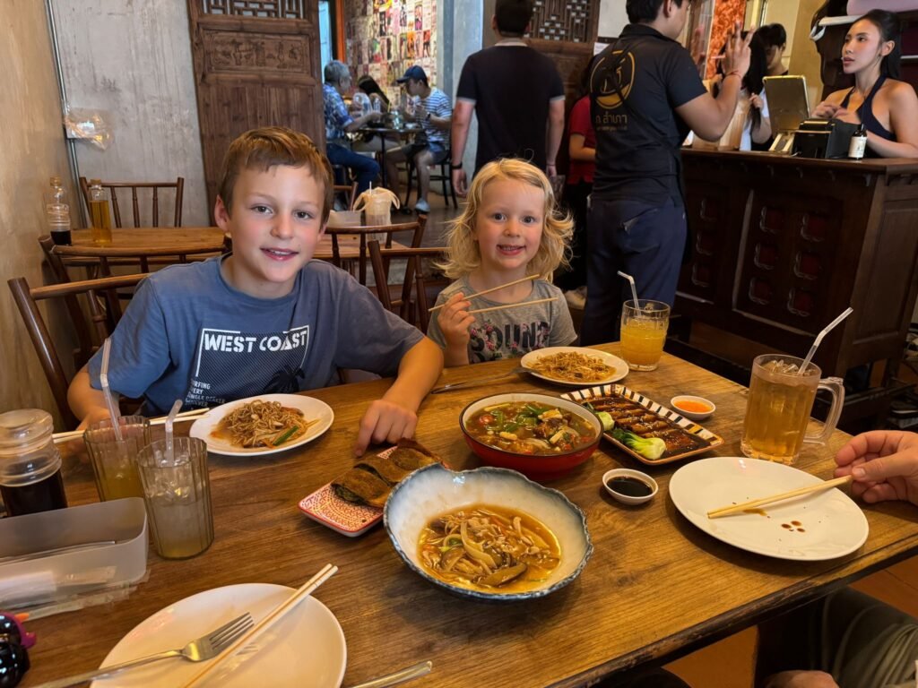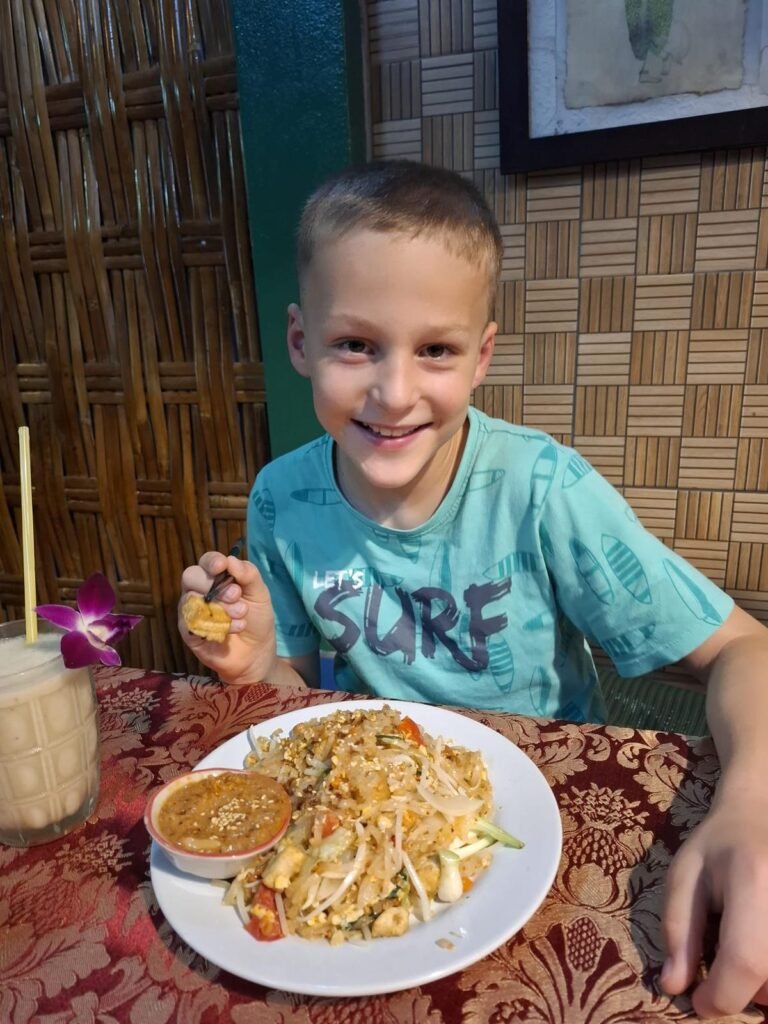 Am nächsten Morgen schlafen wir erst einmal aus – bis 9 Uhr. Das Frühstück in Thailand überrascht uns: Statt Brötchen und Marmelade gibt es Nudelsuppe, gebratenen Reis und andere herzhafte Gerichte. Ungewohnt, aber köstlich. Zum Glück gibt es immer frische Säfte und Smoothies, die den Start in den Tag leichter machen.