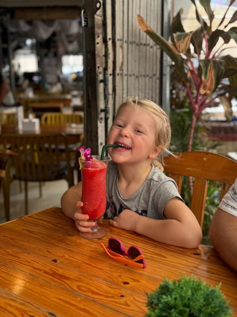 Jetzt erkunden wir die Gegend und schlendern nur herum. Unterwegs reihen sich kleine Läden aneinander – Stoffe, Kleidung, Souvenirs, Schmuck. Mira findet eine wunderschöne Hose, Alex ein paar neue FlipFlops, und die Kinder freuen sich über frische Kokosnüsse.
