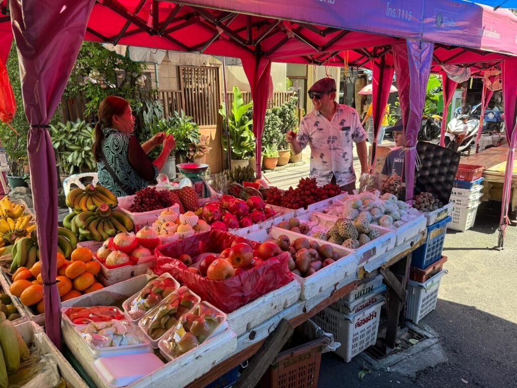 Als alles erledigt ist, zieht es uns raus: Wir fahren zur berühmten Kho San Road, schlendern durch die Gassen und genießen Streetfood. Auf dem Markt kaufen wir Kleinigkeiten, probieren neue Snacks und beobachten das bunte Treiben.