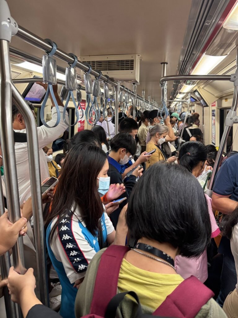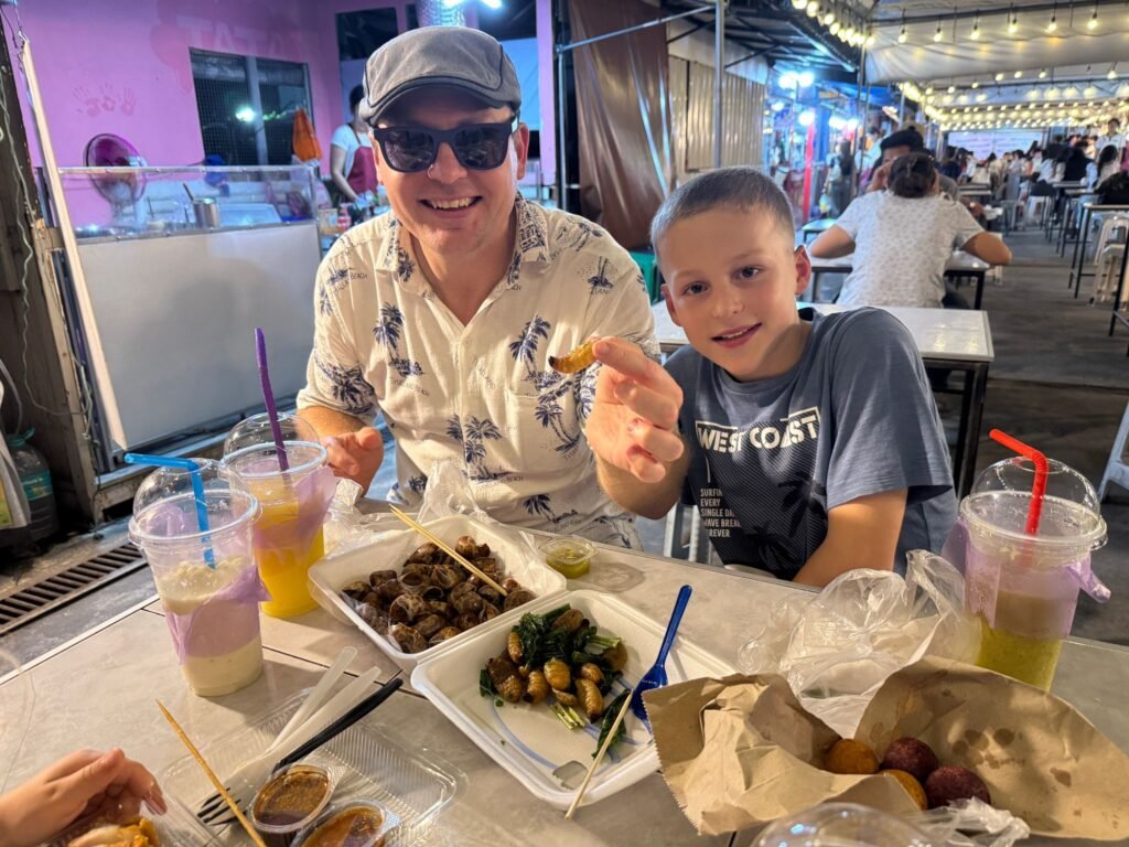 Später fahren wir mit der Metro zu einem Nachtmarkt, auf dem fast ausschließlich Einheimische unterwegs sind. Wir fallen als Touristen auf – und werden neugierig, aber freundlich beäugt. Der Markt ist laut, bunt und authentisch. Es gibt thailändische Spezialitäten, die man nicht überall findet: Seidenraupen, Schnecken, gebratene Insekten. Natürlich probieren wir alles – und ja, es schmeckt besser, als es klingt.