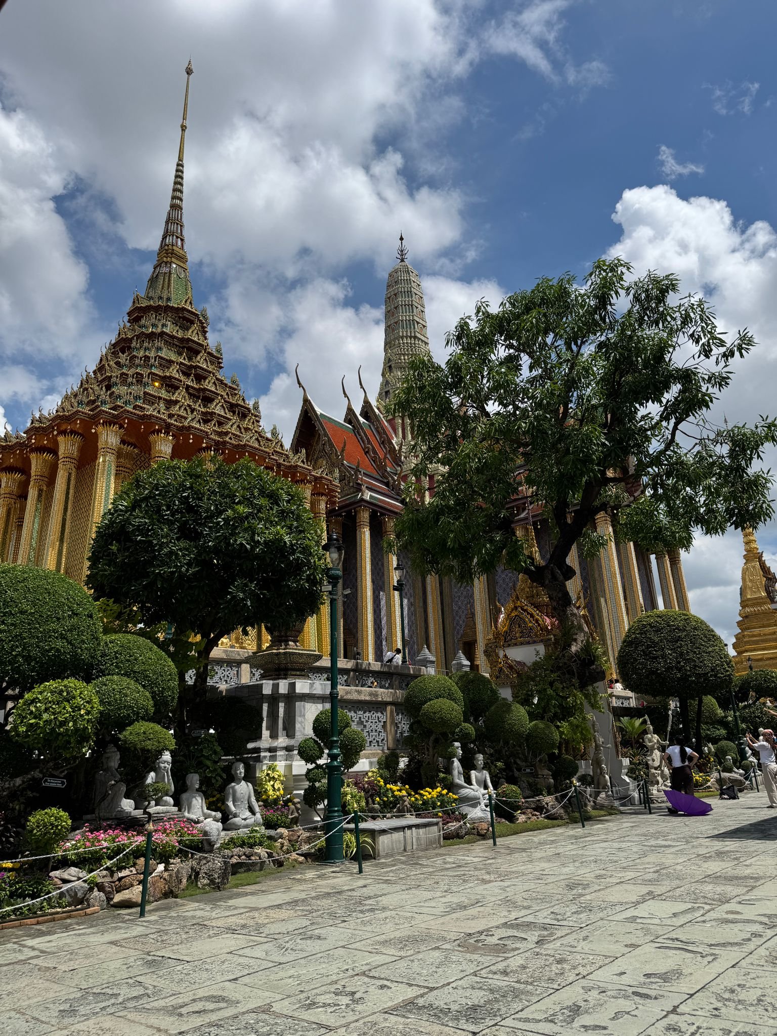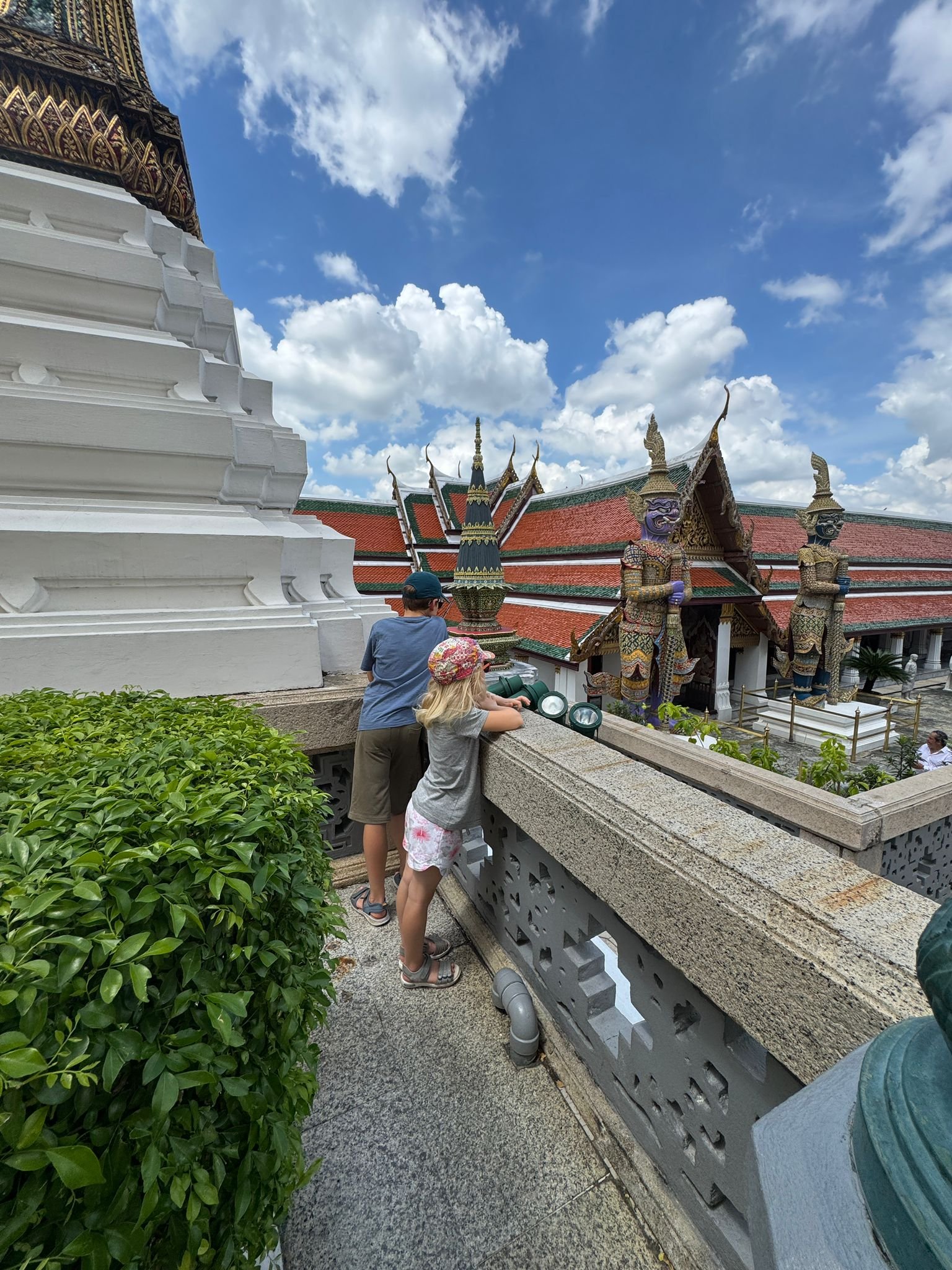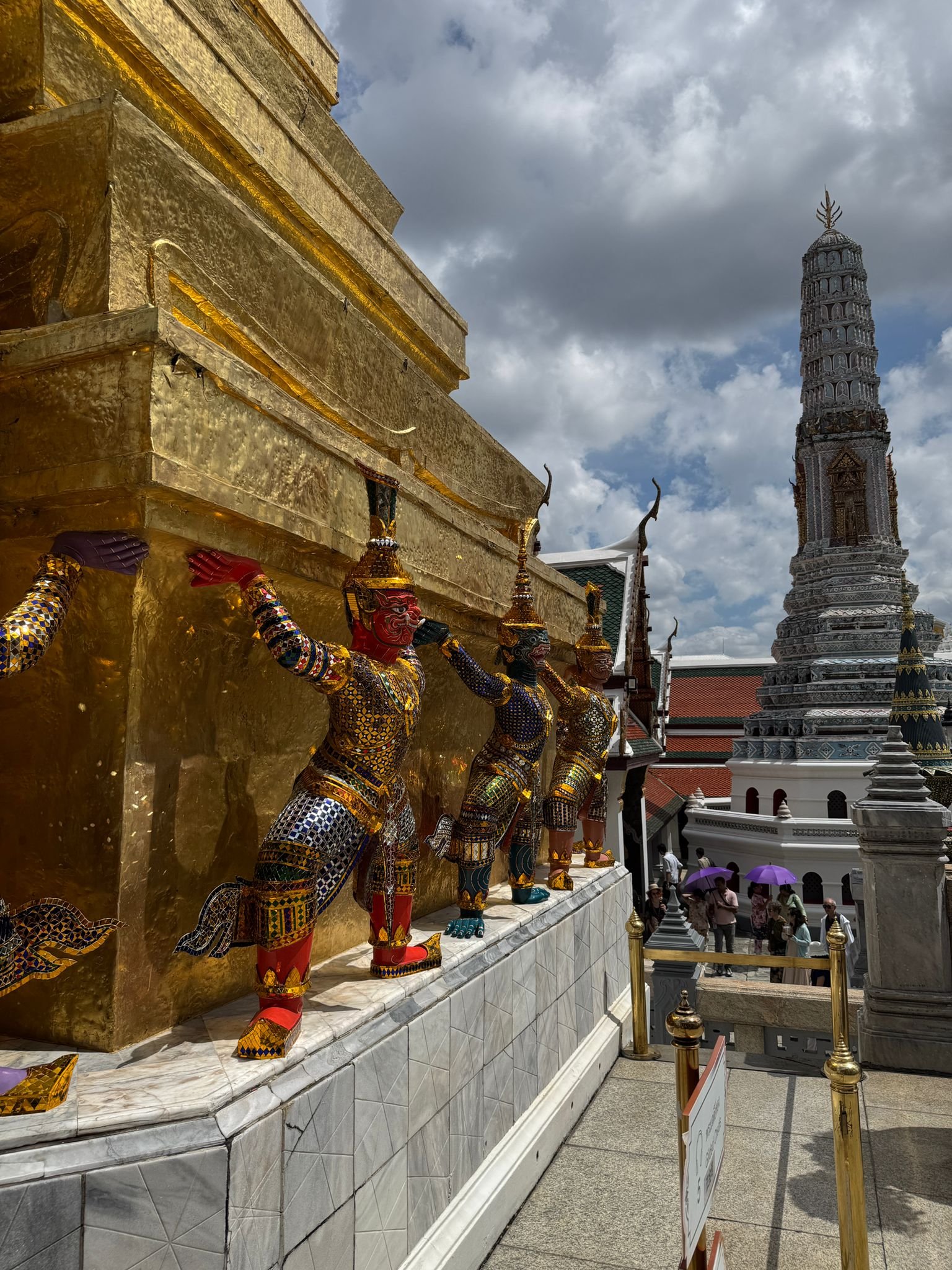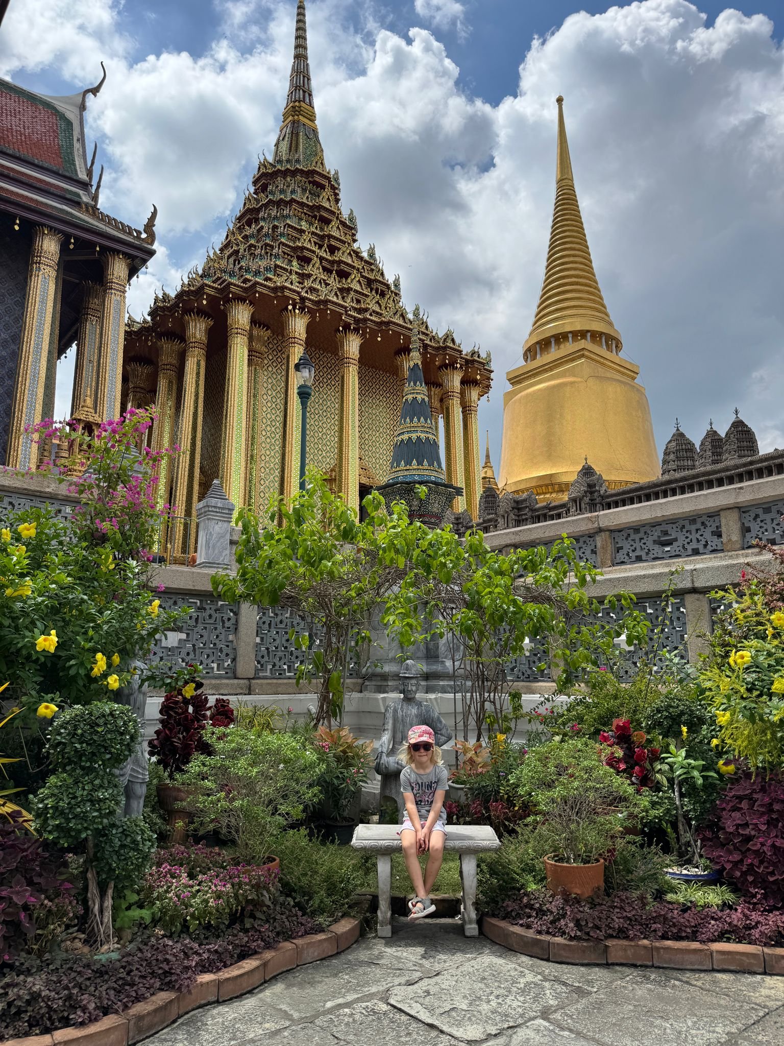 Die Kinder meinen er ist nicht spannend – aber spannend muss es ja auch nicht immer sein. Die Anlage ist atemberaubend: Überall funkeln winzige Mosaikfliesen, Millionen kleine Spiegelstücke, die in der Sonne glitzern. Goldene Figuren, halb Mensch, halb Tier, bewachen die Tempel. Die Dächer leuchten in kräftigen Farben. Jede Statue, jedes Detail ist ein kleines Kunstwerk. Man kann sich kaum vorstellen, wie viel Arbeit und Hingabe in diesem Bauwerk steckt.