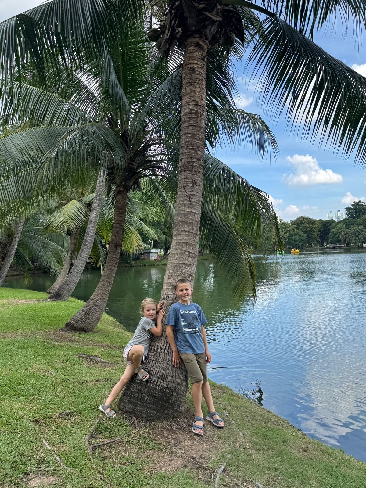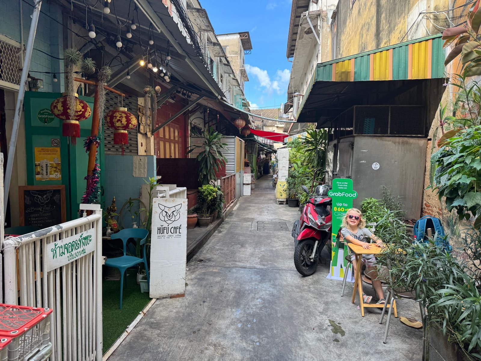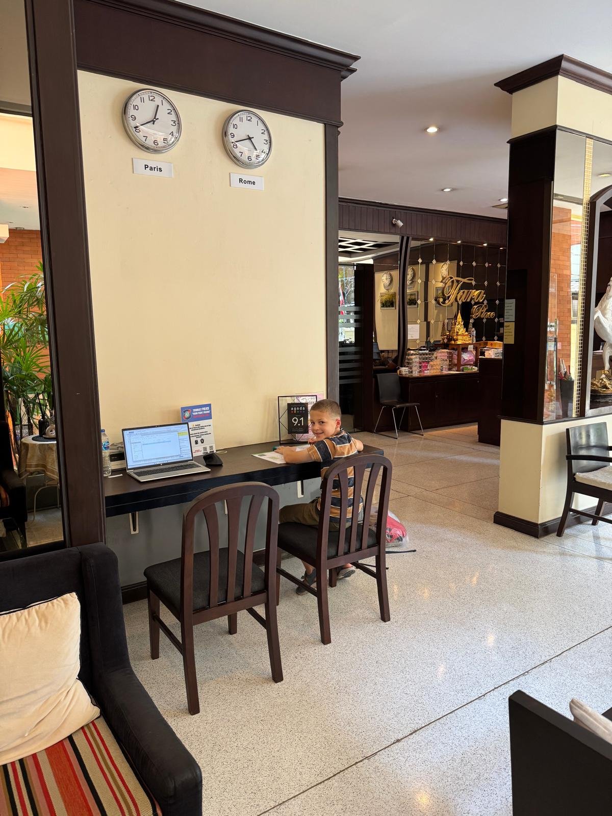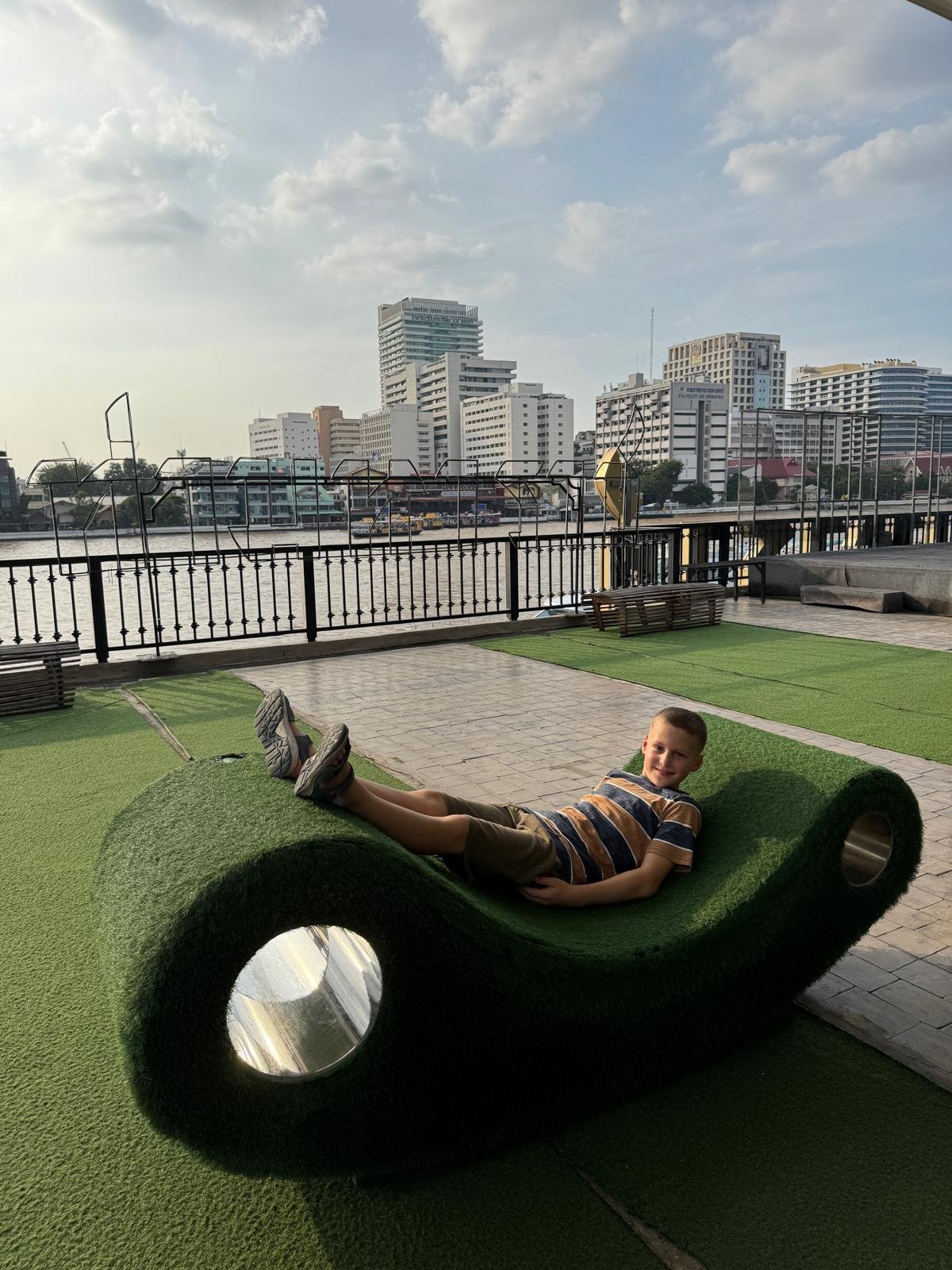 Die Stimmung ist aufgeregt und fröhlich. Mira und die Kinder können es kaum erwarten, das große Abenteuer zu beginnen. Von Hamburg nach Zürich läuft noch alles entspannt. Doch auf dem Flug nach Abu Dhabi versucht jeder, ein bisschen Schlaf zu finden – mit mäßigem Erfolg. Schließlich, im letzten Abschnitt nach Bangkok, ist die Müdigkeit groß, aber immerhin schaffen wir es, zwischendurch ein paar Minuten die Augen zuzumachen. In Bangkok angekommen, draußen sind es 30 Grad, die Luft ist warm und feucht, wir sind plötzlich wirklich da und sind überrascht, dass es doch so schnell ging. Anstelle von Uber gibt es hier Grab, und schon eine halbe Stunde später stehen wir vor unserem Hotel.