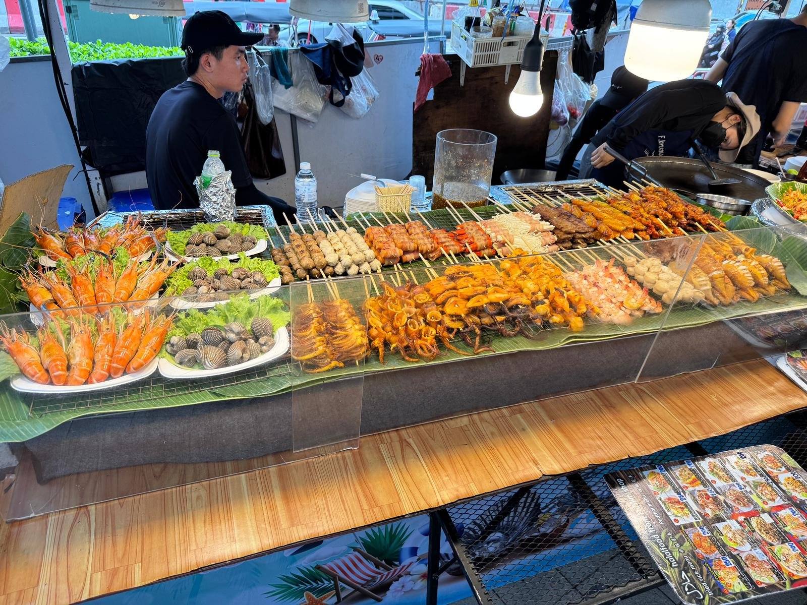 Später fahren wir mit der Metro zu einem Nachtmarkt, auf dem fast ausschließlich Einheimische unterwegs sind. Wir fallen als Touristen auf – und werden neugierig, aber freundlich beäugt. Der Markt ist laut, bunt und authentisch. Es gibt thailändische Spezialitäten, die man nicht überall findet: Seidenraupen, Schnecken, gebratene Insekten. Natürlich probieren wir alles – und ja, es schmeckt besser, als es klingt.