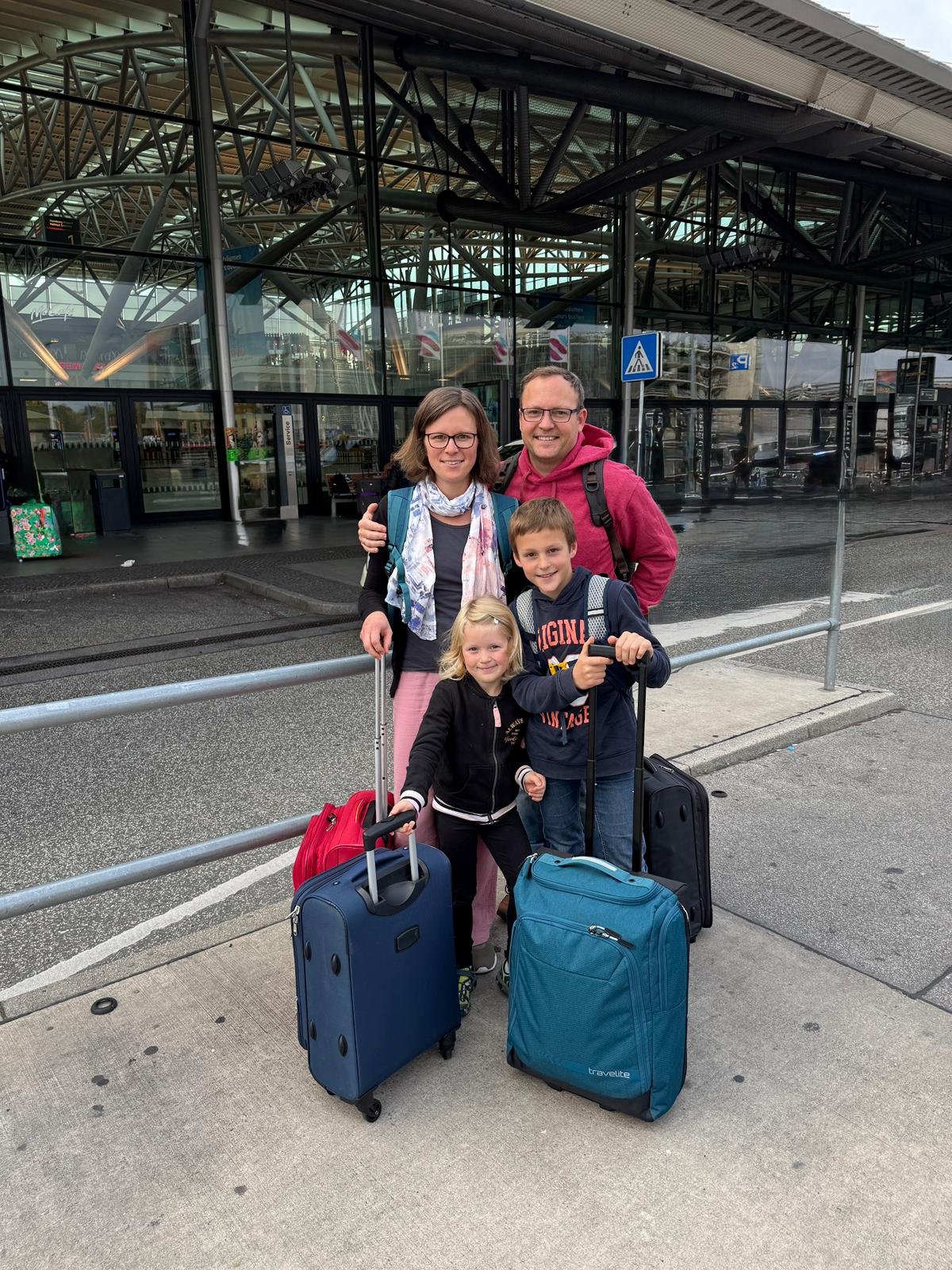 Freitagabend, die Herbstferien beginnen und 18 Uhr geht es los! Alex arbeitet natürlich wieder bis zur letzten Minute, beinahe hätte er den Laptop noch mit ins Auto genommen. Zum Glück war sonst alles vorbereitet: Koffer gepackt, Snacks verstaut, Reisedokumente griffbereit. Nur noch einsteigen und los – Opa Martin bringt uns sicher zum Flughafen.