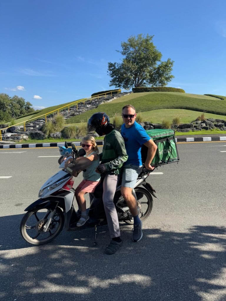 Nach dem Park wollten wir noch einen Tempel auf dem Berg besichtigen. Zu Fuß war es allerdings deutlich zu weit, und Grab-Auto-Fahrer gab es in diesem Moment weit und breit keine. Es blieb also nur eine Option: Jeweils zwei Grab-Roller mieten.