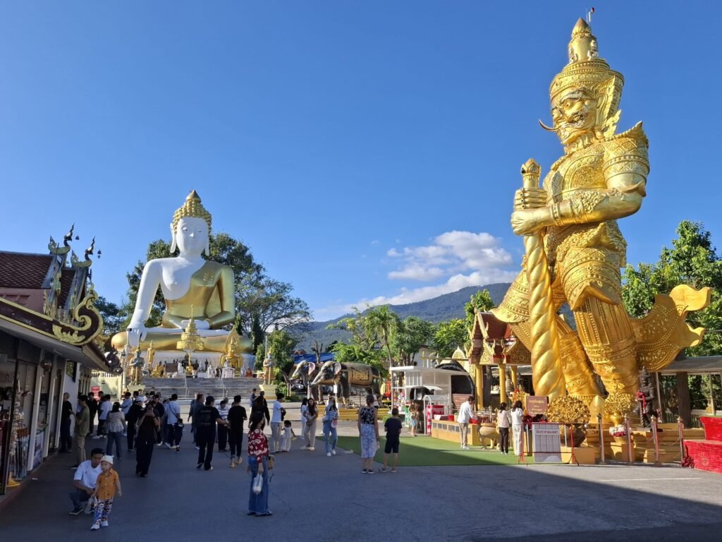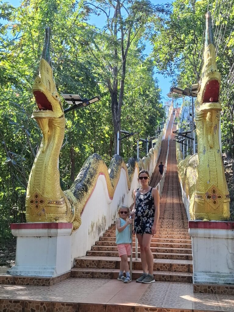 Dort warteten 490 Stufen auf uns. Nach dem Aufstieg wurden wir mit einem fantastischen Rundblick über Chiang Mai belohnt. Riesige Buddha-Statuen, friedliche Stimmung und eine angenehme Brise – es war die Mühe wert.