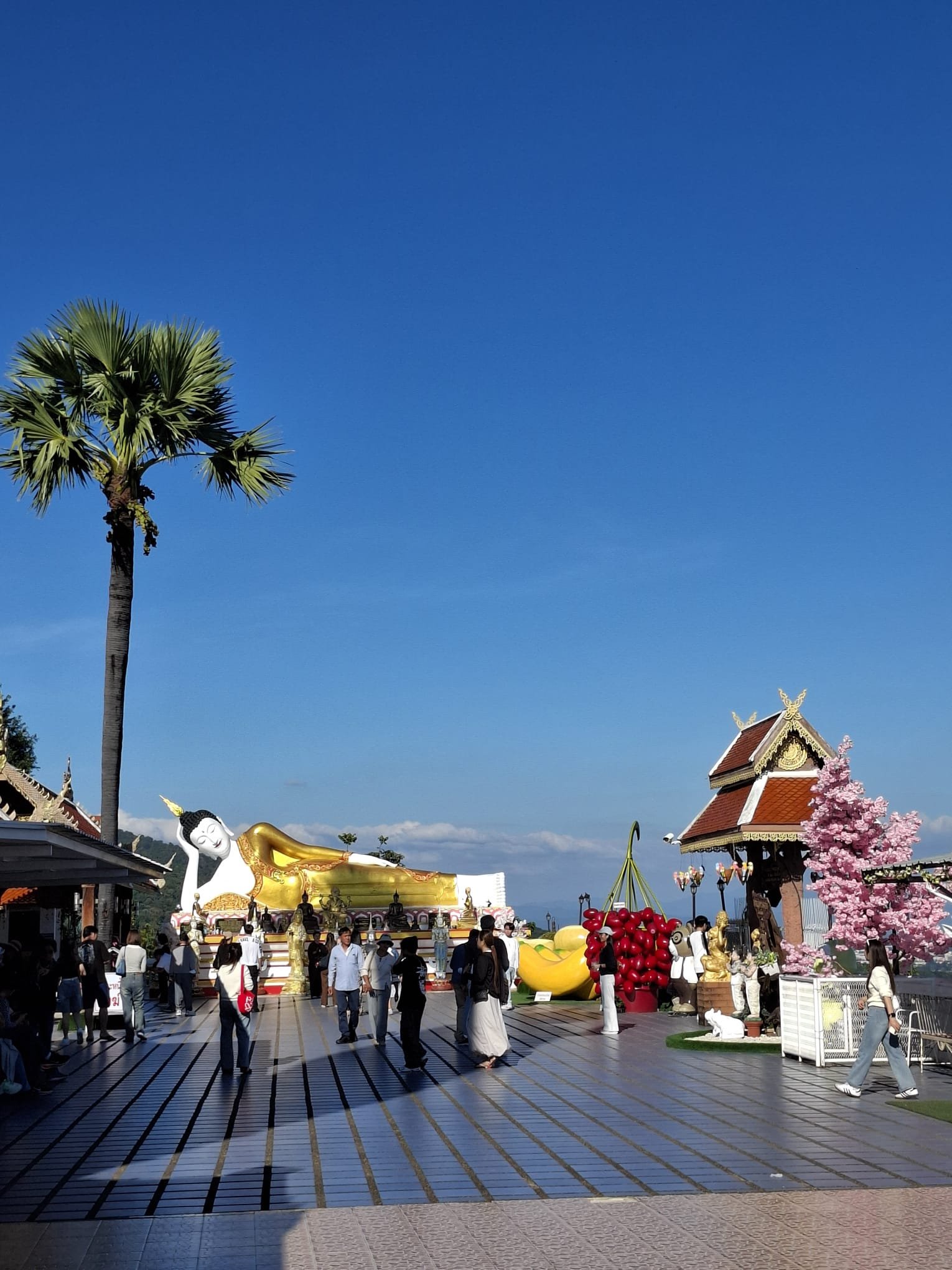 Dort warteten 490 Stufen auf uns. Nach dem Aufstieg wurden wir mit einem fantastischen Rundblick über Chiang Mai belohnt. Riesige Buddha-Statuen, friedliche Stimmung und eine angenehme Brise – es war die Mühe wert.