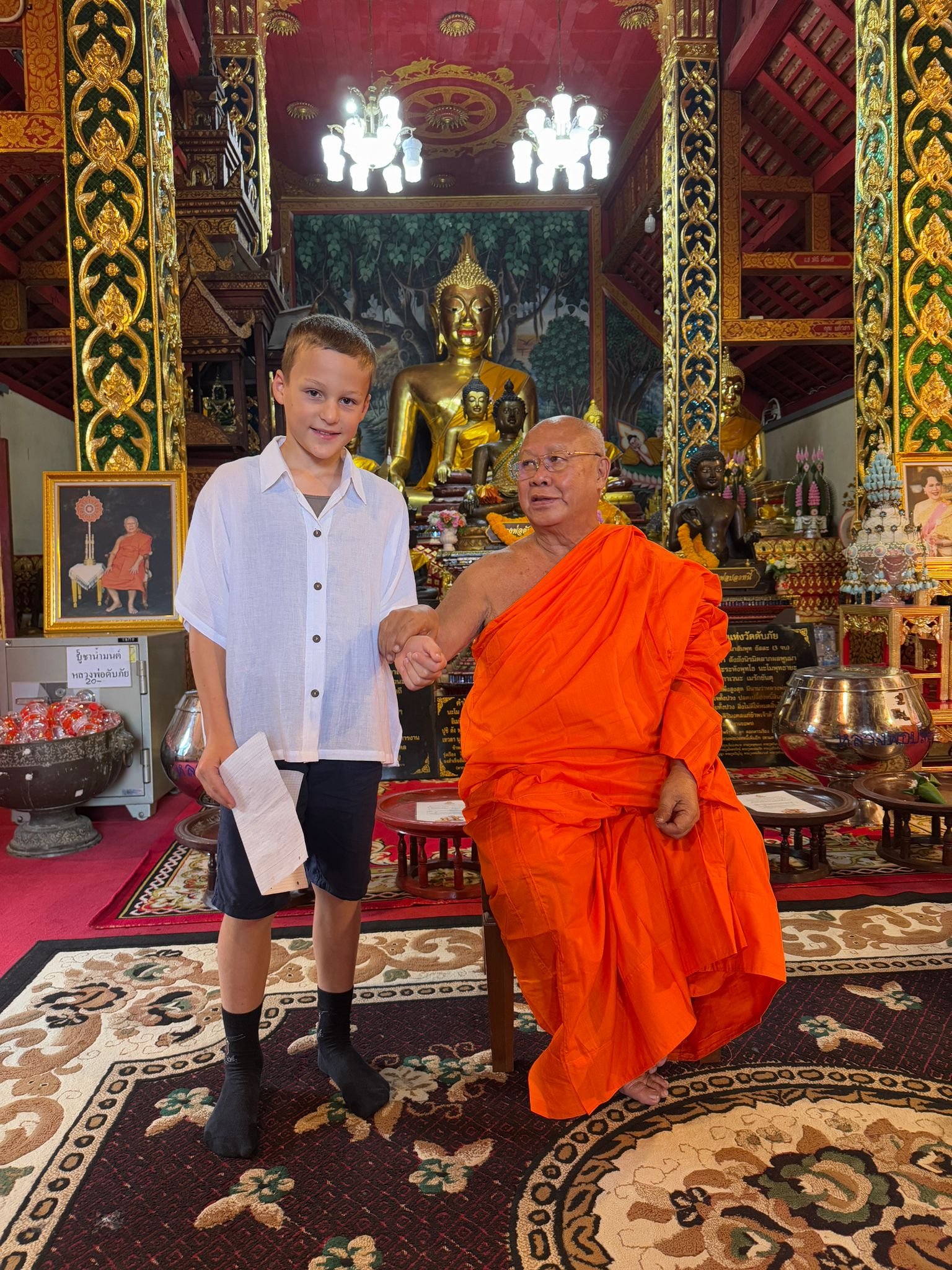 Besonders stolz sind wir darauf, wie gut unsere Kinder mit dieser neuen Lebenssituation umgehen. Fremdes Land, fremde Sprache, andere Abläufe – und doch wachsen sie jeden Tag ein Stück über sich hinaus. Kilean hat in dieser Woche sogar ein Referat über buddhistische Mönche vorbereitet und es bei YouTube für seine Klasse hochgeladen.